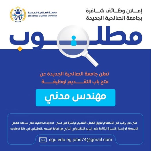 وذكرت جامعة الصالحية الجديدة أنه على من يرغب فى الانضمام لفريق العمل، التقديم في مقر الجامعة مباشرة خلال ساعات العمل الرسمية من الساعة 9 صباحًا حتى الساعة 4 مساءًا، أو إرسال السيرة الذاتية على البريد الإلكتروني التالي مع كتابة المسمى الوظيفي في خانة: subject - [email protected]