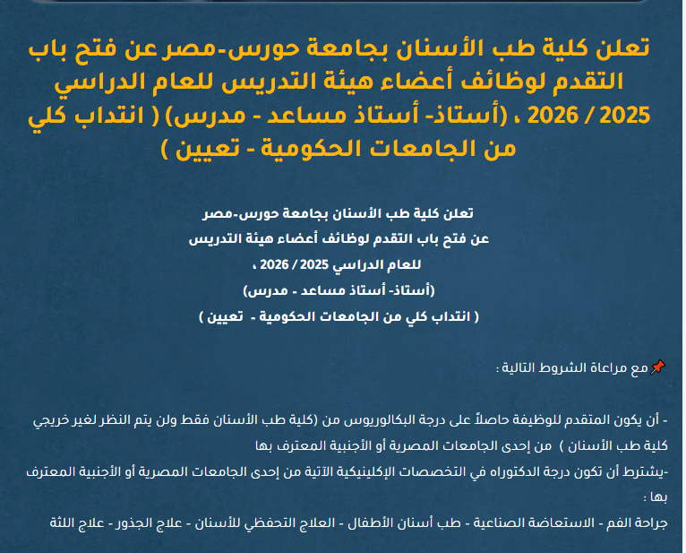 كما أعلنت جامعة حورس عن حاجة كلية طب الأسنان بالجامعة لوظائف أعضاء هيئة التدريس للعام الدراسي 2025-2026، (أستاذ- أستاذ مساعد – مدرس)