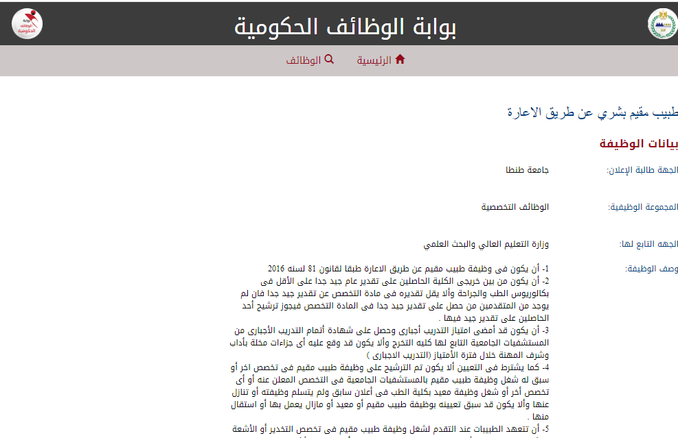 الوظائف المطروحة تتركز في وظيفة طبيب مقيم بشري عن طريق الإعارة، حيث اشترطت جامعة طنطا أن يكون المتقدم حاصلًا على درجة البكالوريوس في الطب والجراحة من كلية الطب بالجامعة، وأن تتوافر فيه مجموعة من المعايير الأكاديمية والمهنية المحددة. ومن أبرز هذه الشروط أن يكون المتقدم من بين الحاصلين على تقدير عام لا يقل عن جيد جدًا في مرحلة البكالوريوس، وألا يقل تقديره في مادة التخصص المطلوب عن جيد جدًا، وفي حالة عدم وجود العدد الكافي من المتقدمين الحاصلين على هذا التقدير يمكن قبول المرشحين الحاصلين على تقدير جيد في التخصص.