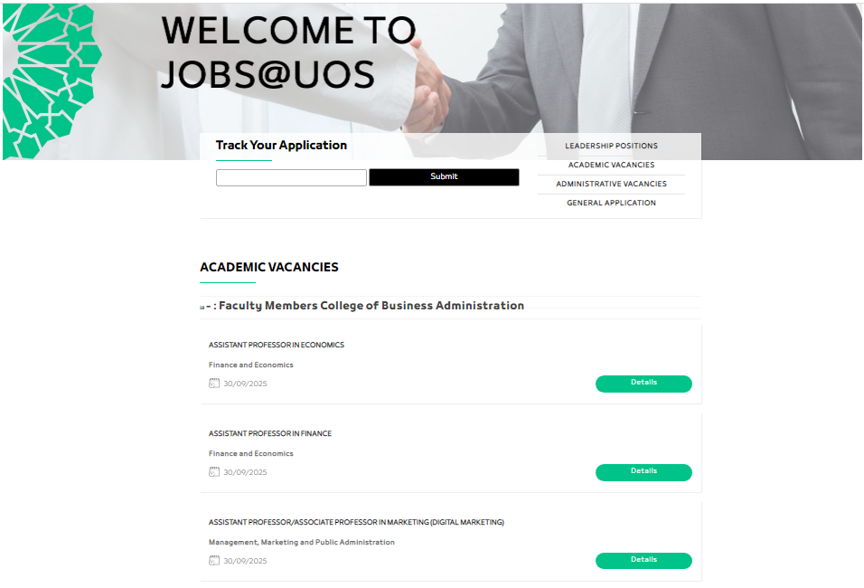 في كلية إدارة الأعمال، أعلنت الجامعة عن توفر عدة وظائف أكاديمية في مجالات أساسية تدعم سوق العمل الإقليمي والعالمي. وتشمل هذه التخصصات الاقتصاد، والمالية، والتسويق الرقمي، إضافة إلى إدارة الموارد البشرية والسلوك التنظيمي.