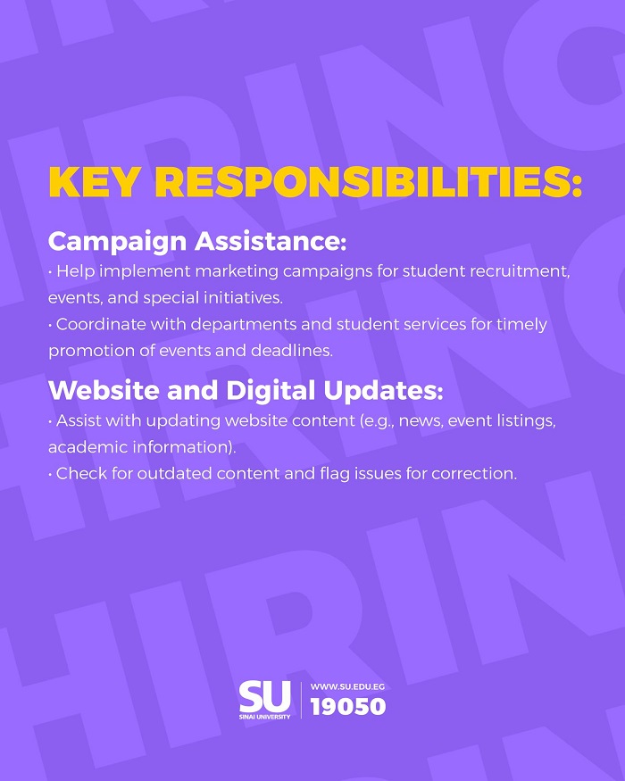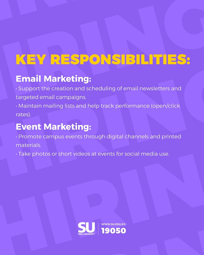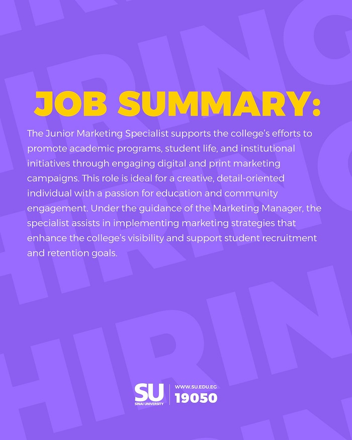 يدعم أخصائي التسويق المبتدئ جهود الكلية لتعزيز البرامج الأكاديمية والحياة الطلابية والمبادرات المؤسسية من خلال حملات تسويقية رقمية ومطبوعة جذابة.