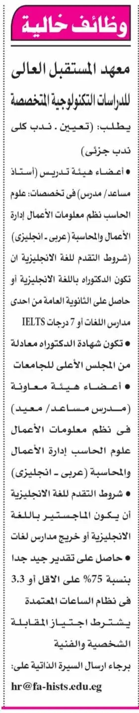 - أعضاء هيئة التدريس وظائف معهد المستقبل العالي للدراسات