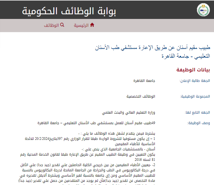 وينص القرار على أن التعيين في وظيفة طبيب مقيم يتم عن طريق الإعارة وفقًا لقانون الخدمة المدنية رقم 81 لسنة 2016. كما شددت الجامعة على ضرورة أن يكون المتقدم حاصلًا على تقدير جيد جدًا على الأقل في درجة البكالوريوس في طب الأسنان من جامعة القاهرة، وألا يقل تقديره في مادة التخصص عن جيد جدًا، مع إمكانية قبول الحاصلين على تقدير جيد في مادة التخصص إذا لم يتوافر العدد الكافي من المرشحين.