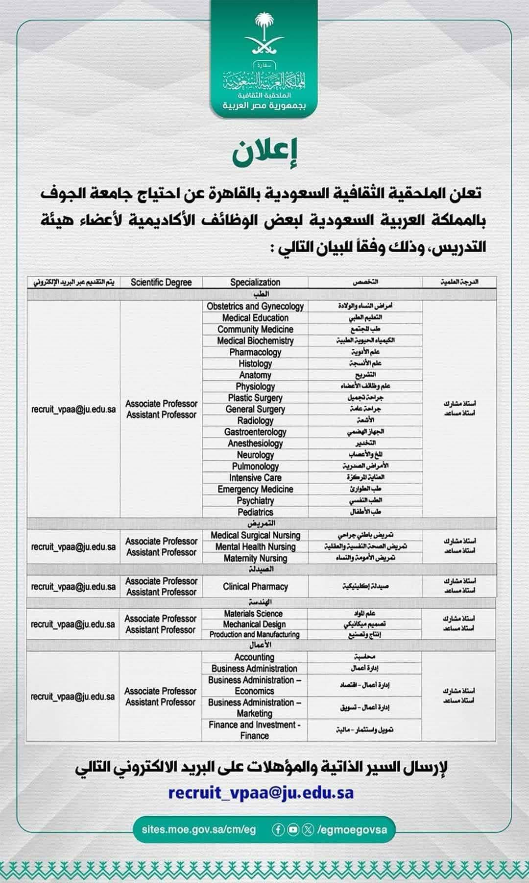 وظيفة جامعة.. أعلنت الملحقية الثقافية السعودية بالقاهرة عن احتياج جامعة الجوف بالمملكة العربية السعودية لعدد من أعضاء هيئة التدريس من الأساتذة المساعدين والأساتذة المشاركين في مختلف التخصصات الطبية والعلمية والهندسية والإدارية، وذلك ضمن خطة الجامعة لتوسيع قاعدة الكفاءات الأكاديمية وتعزيز قدراتها التعليمية والبحثية.