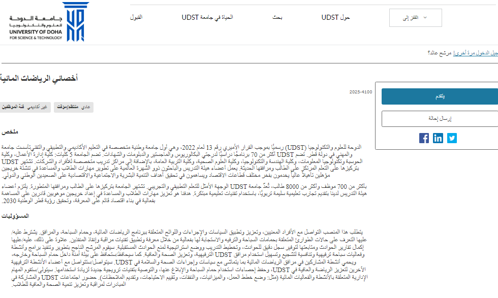 وظيفة جامعة.. أعلنت جامعة الدوحة للعلوم والتكنولوجيا في دولة قطر عن توفر وظيفة شاغرة بمسمى أخصائي الرياضات المائية ضمن فئة الموظفين غير الأكاديميين العاديين، وذلك في إطار خطط الجامعة لتوسيع نطاق خدماتها الترفيهية وتعزيز برامج الصحة والعافية.
