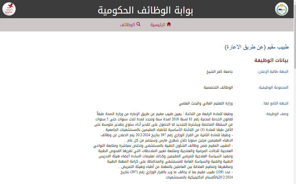 كما أوضح الإعلان أن التقديم يقتصر على خريجي جامعة كفر الشيخ ممن أنهوا فترة الامتياز بمستشفياتها الجامعية وحصلوا على شهادة إتمام التدريب الإجباري. ويُشترط كذلك ألا يكون المتقدم قد سبق له التعيين كطبيب مقيم أو معيد في أي جامعة مصرية، وألا يكون قد تم ترشيحه سابقًا لنفس الوظيفة وتنازل عنها.