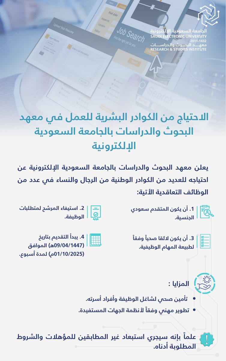 أعلن معهد البحوث والدراسات بالجامعة السعودية الإلكترونية عن توفر عدد من الوظائف التعاقدية (رجال ونساء) للكوادر الوطنية، ويهدف ذلك إلى تعزيز الكفاءات الوطنية في مجالات متخصصة، وذلك وفقًا للتفاصيل الموضحة أدناه.