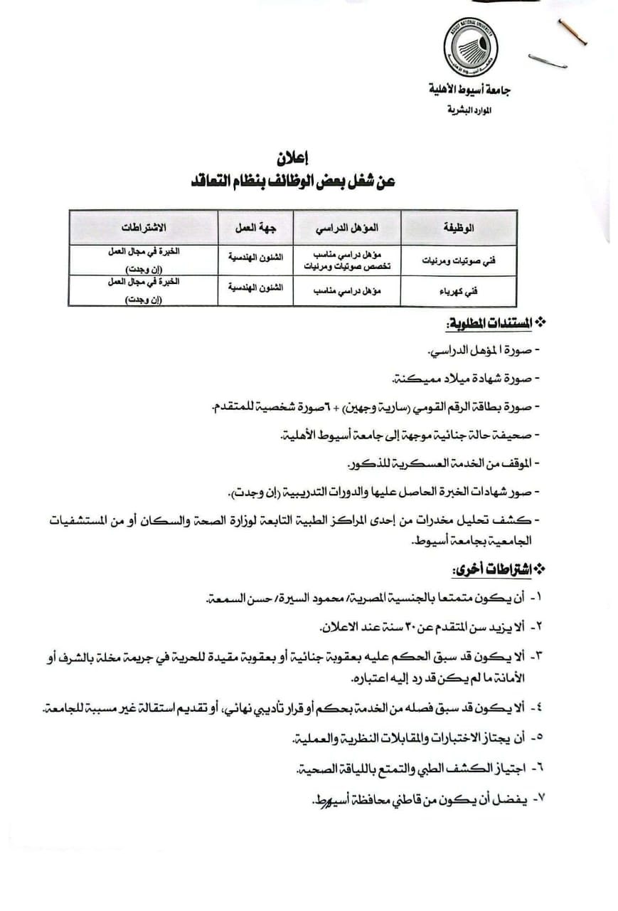 - المستندات المطلوبة في وظائف جامعة أسيوط الأهلية