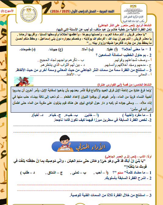 - أولى ثانوي اللغة العربية ترم أول تقييم الأسبوع الثالث