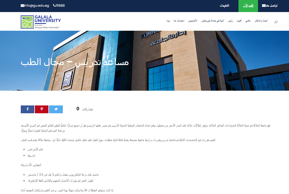وظيفة جامعة .. أعلنت جامعة الجلالة إحدى الجامعات الوطنية الحديثة في مصر، عن فتح باب التقديم لوظائف أكاديمية جديدة في كلية الطب، حيث تبحث الكلية عن مجموعة من مساعدي التدريس المؤهلين للانضمام إلى هيئتها الأكاديمية وتقديم المقررات الدراسية في تخصصي علم الأمراض والتشريح.