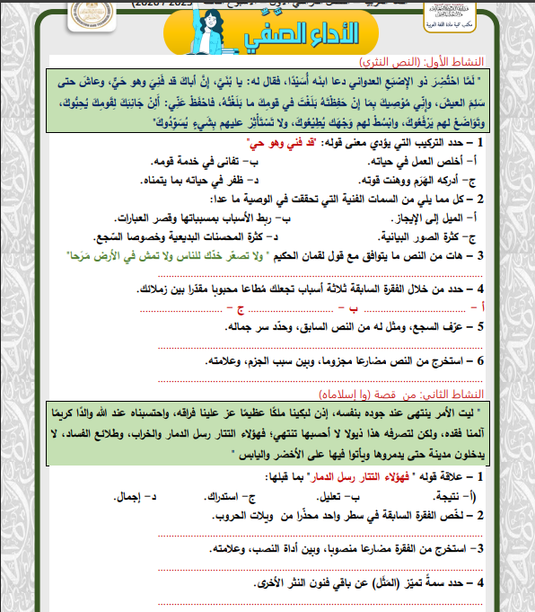 مراجعات نهائية في مقرر الفصل الدراسي الأول في اللغة العربية