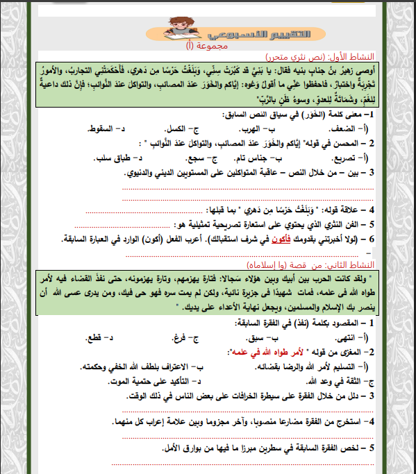 - التقييم الأسبوع لغة عربية ثانية ثانوي