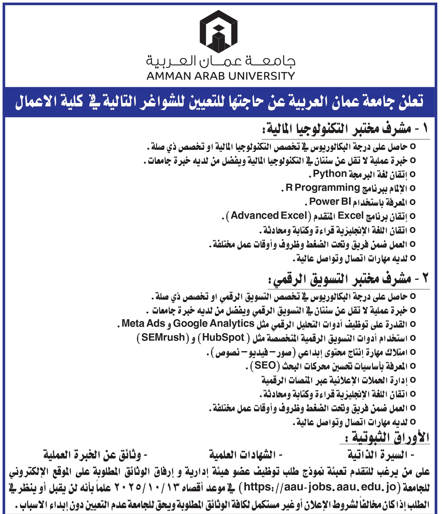 على من يرغب للتقدم تعبئة نموذج طلب توظيف عضو هيئة إدارية وإرفاق الوثائق المطلوبة على الموقع الإلكتروني لـ جامعة عمان العربية https://aau-jobs، aau.edu.jo) في موعد أقصاه ۱۳ / ١٠ / ٢٠٢٥ علما بأنه لن يقبل أو ينظر في الطلب إذا كان مخالفا لشروط الإعلان أو غير مستكمل لكافة الوثائق المطلوبة ويحق للجامعة عدم التعيين دون إبداء الاسباب.. ولمزيد من التفاصيل الدخول على هذا الرابط.. اضغط هنااااااااااااا .