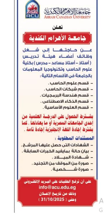 - أخبار وظائف جامعة الأهرام الكندية اليوم