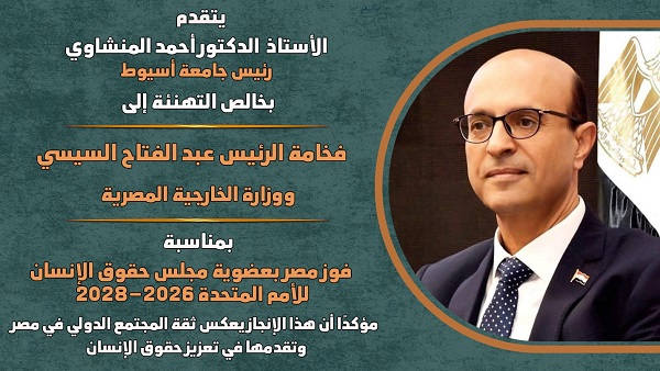 يتقدم الدكتور أحمد المنشاوي، رئيس جامعة أسيوط، بخالص التهنئة للرئيس عبد الفتاح السيسي ووزارة الخارجية المصرية بمناسبة فوز مصر بعضوية مجلس حقوق الإنسان التابع للأمم المتحدة للفترة 2026–2028. ويشير المنشاوي إلى أن هذا الإنجاز يعكس ثقة المجتمع الدولي بمصر ودورها الرائد في تعزيز حقوق الإنسان على المستوى العالمي.