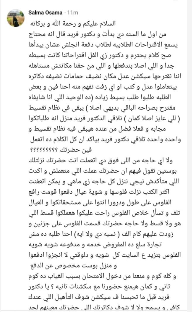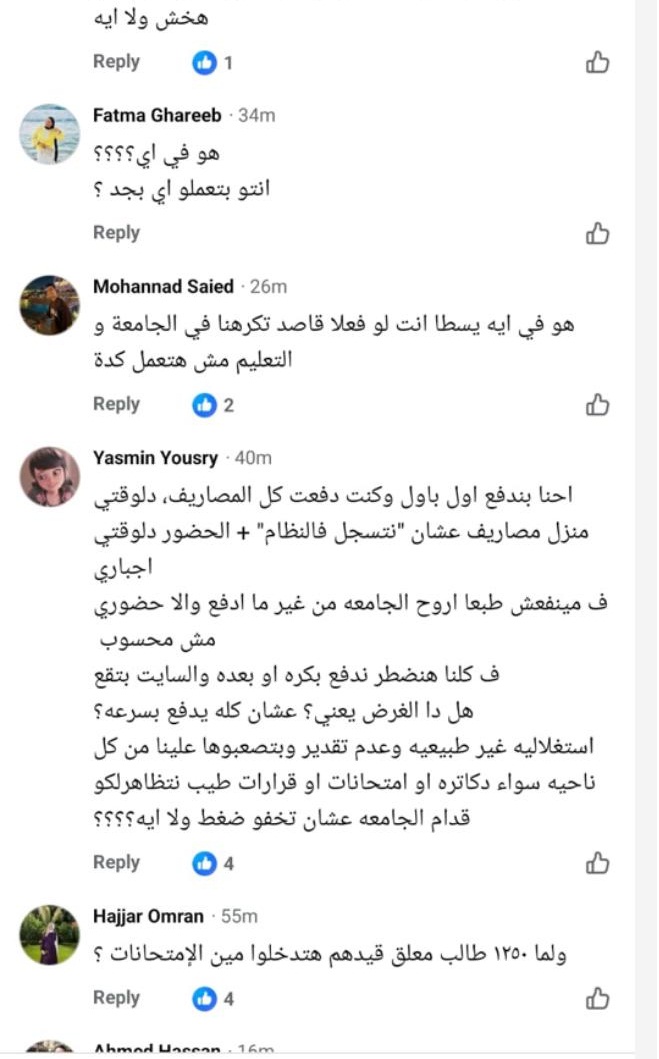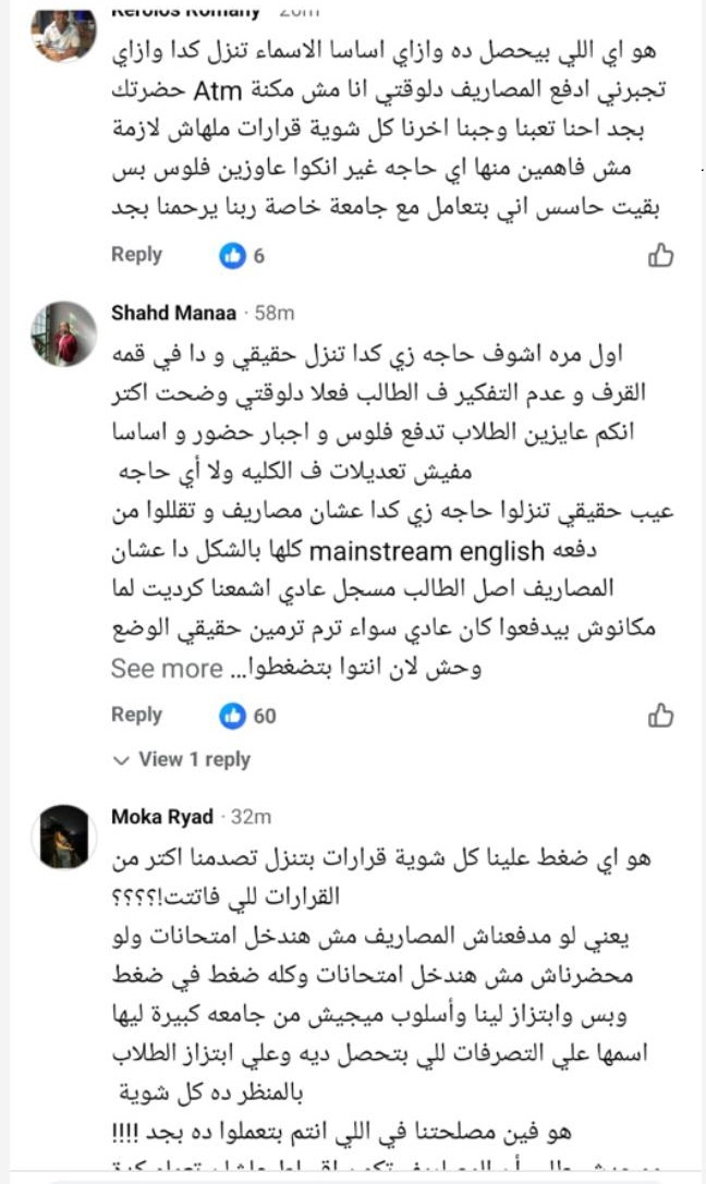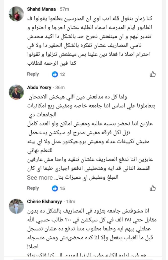 وقال حازم إبراهيم، هو بجد مفهوم "دراسة القرارات قبل تطبيقها" ده مش بيمر علي ادارة الكلية ؟؟ يعني فيه قرارات بتحتاج تغيرات وتطبق تدريجي على مدار كذا سنة وقرارات مينفعش تطبق على دفعات بقالها ٣ سنين في الجامعة مثلا وجايين في اخر سنة وكل شوية نطلع بقرار يربك الدنيا، طيب سنة رابعة مثلا ما هو مش هيتخرج ويشتغل غير ببيان النجاح اللي مش هيطلع غير لما يدفع كل مصاريفه وياخد شهادته، ايه حوار القيد المعلق ده وايه حوار ال ٢٥ فالمية ؟ يعني الناس بتصيح انها عايزة المساحة عشان تعرف تدفع مصاريفها فا انتوا متردوش علينا وبعدها بأسبوع تضغطوا عليهم عشان يدفعوها ؟