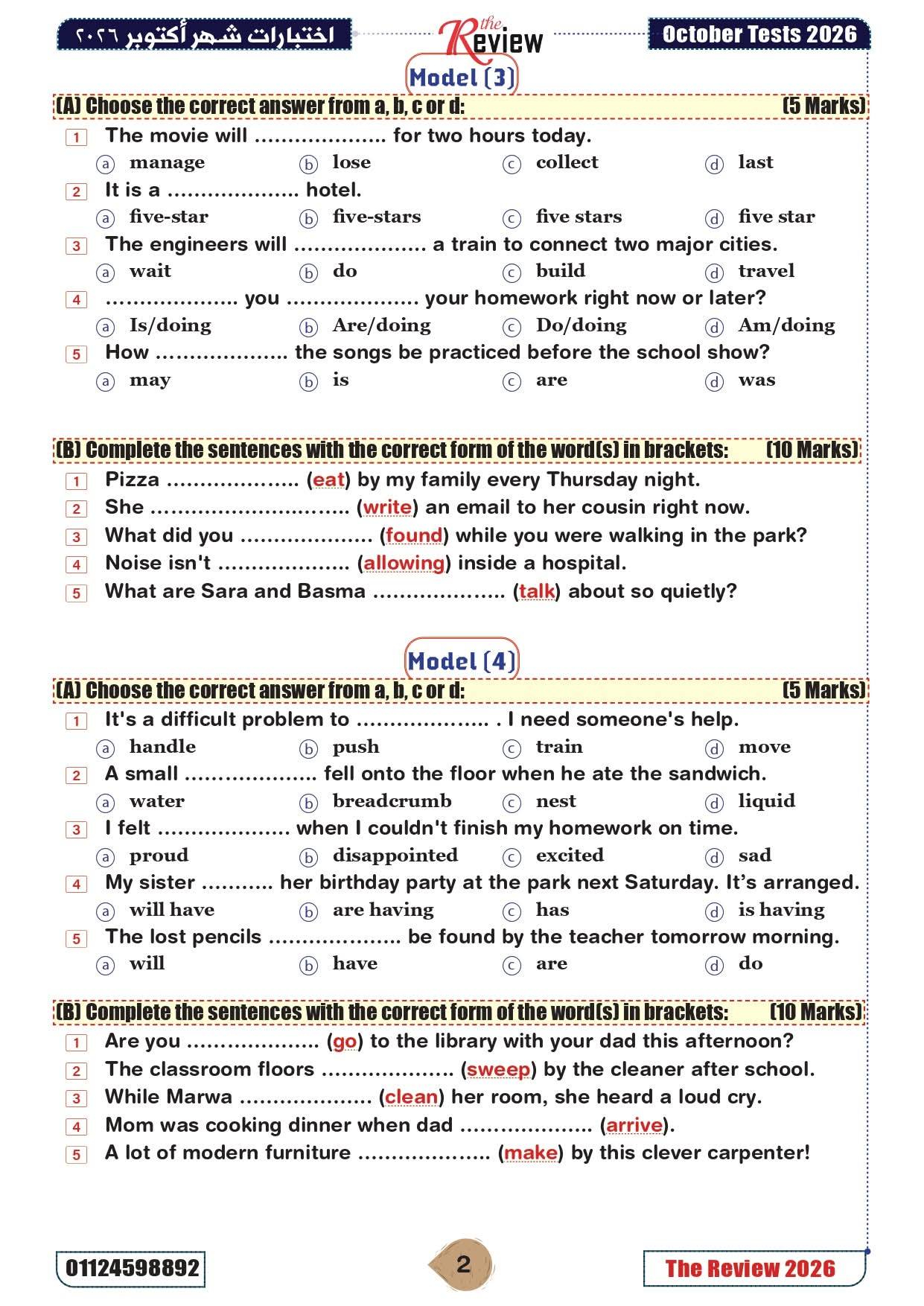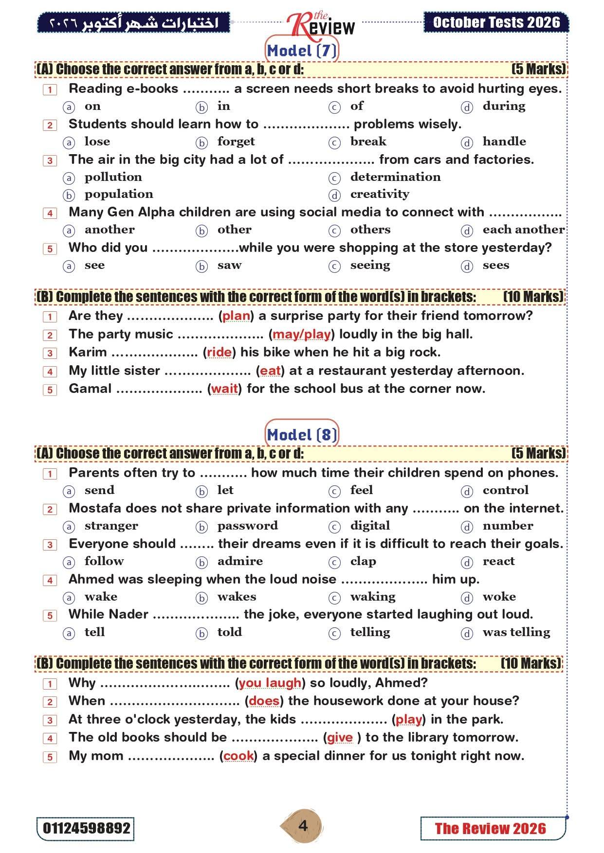 10 اختبارات لن يخرج عنها امتحان شهر أكتوبر إنجليزي ثانية إعدادي