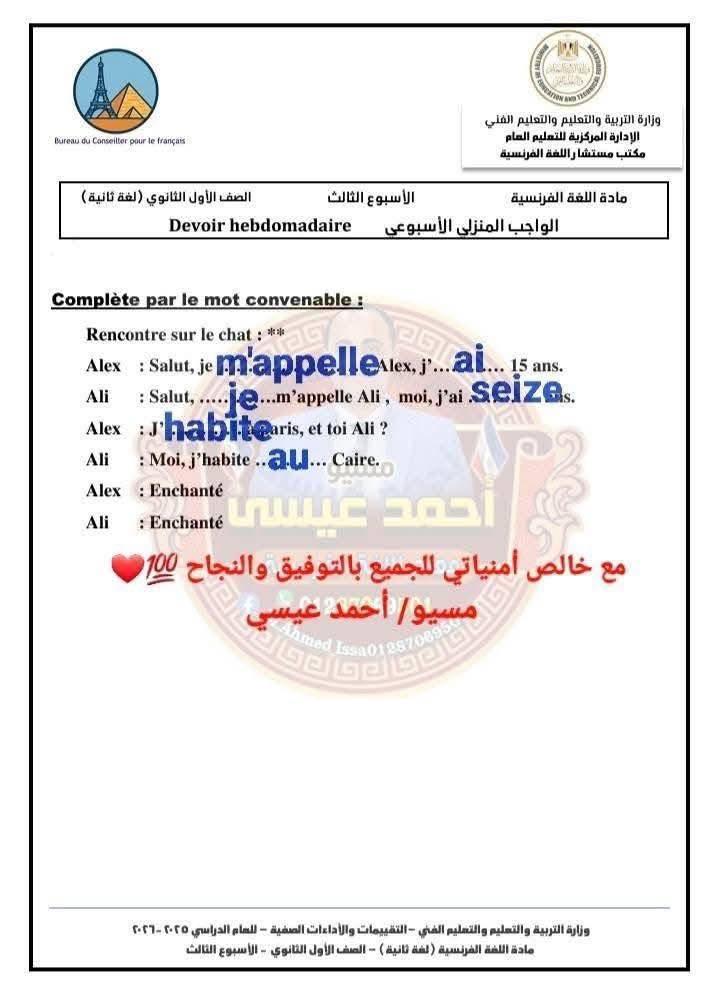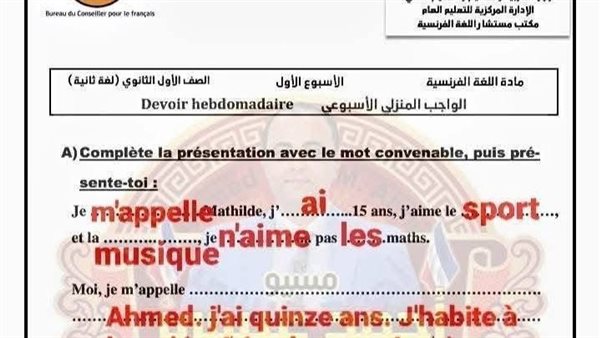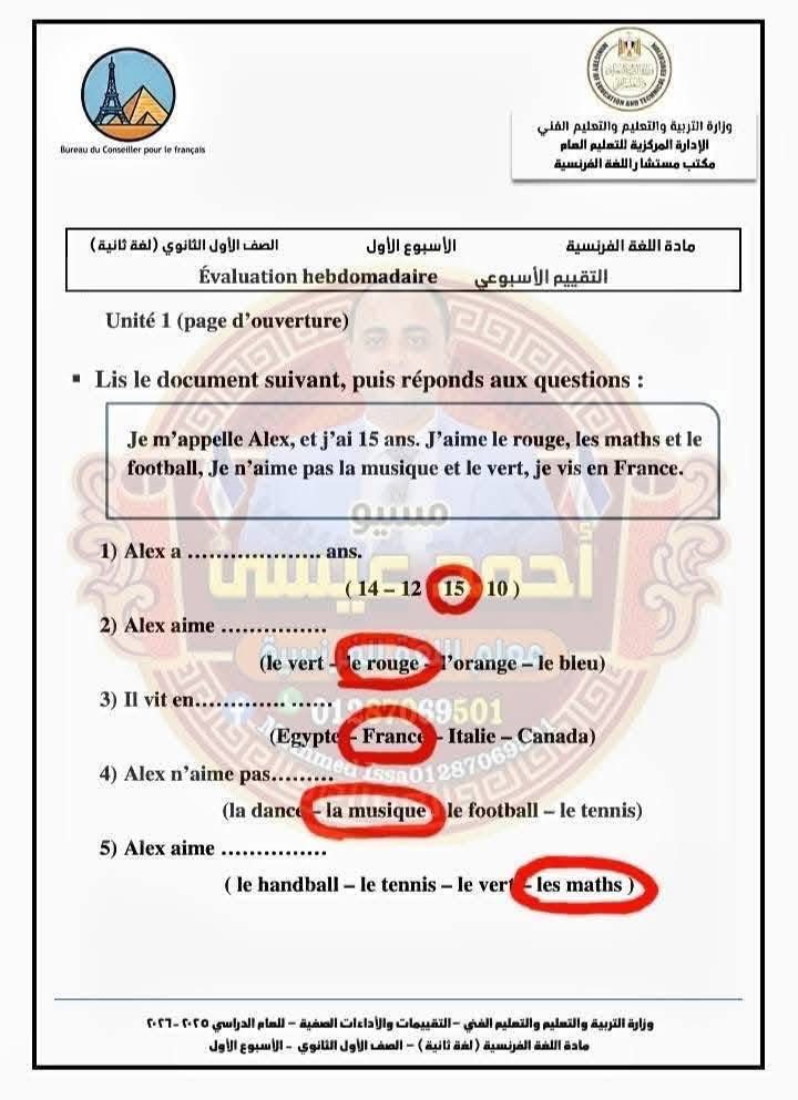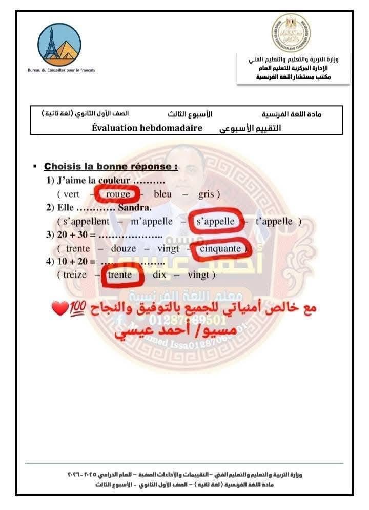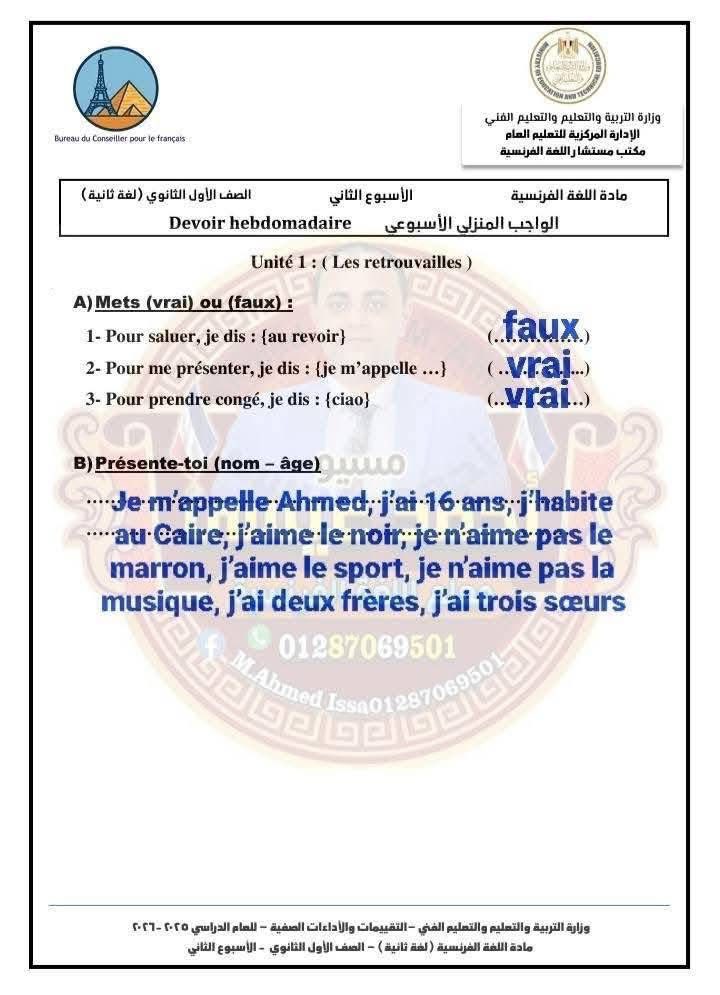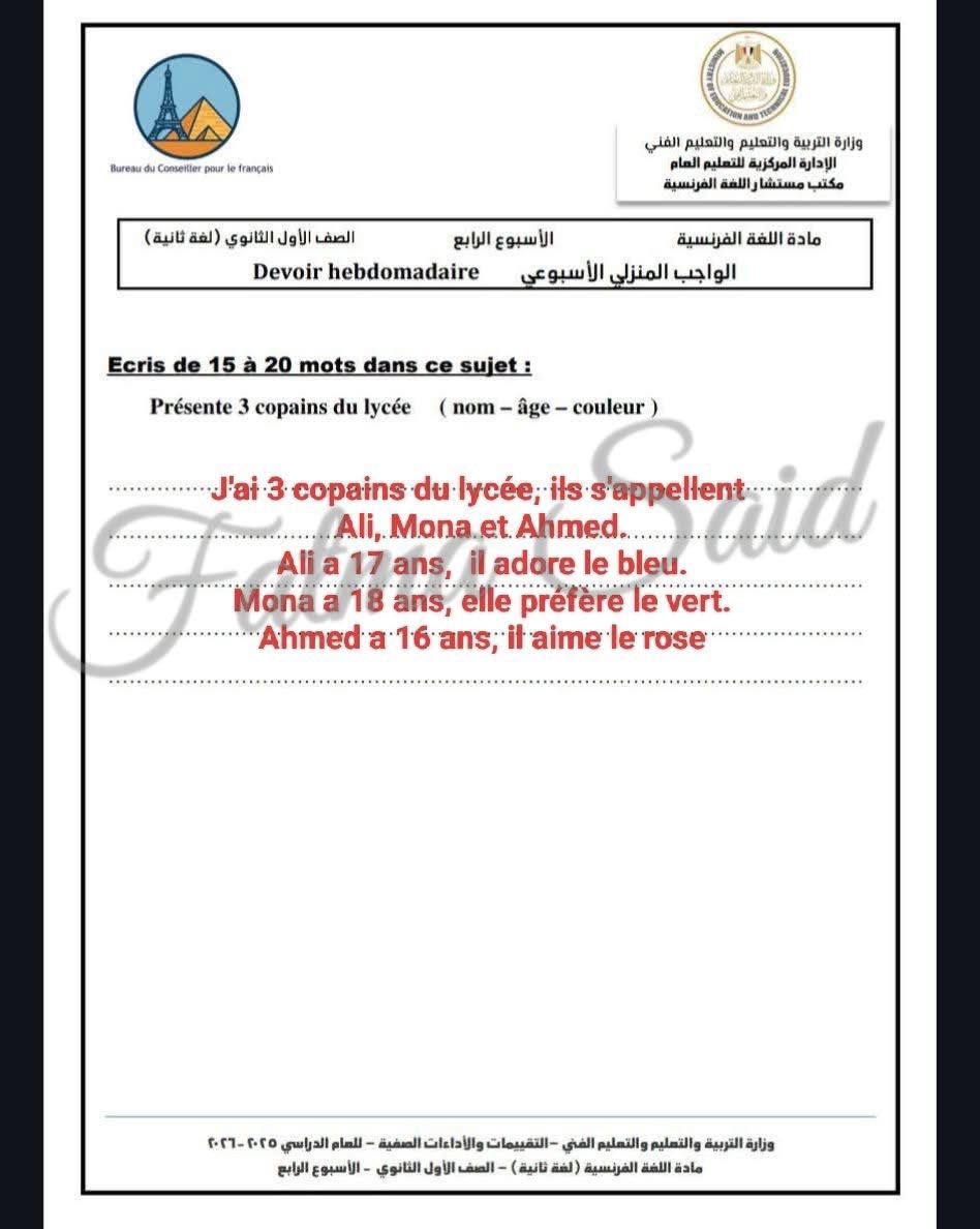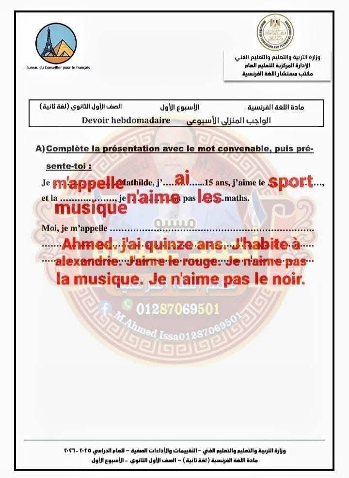 - حل التقييم الاسبوعي للصف الأول الثانوي الفرنساوي الأسبوع الأول إلى الرابع في اللغة الفرنسية