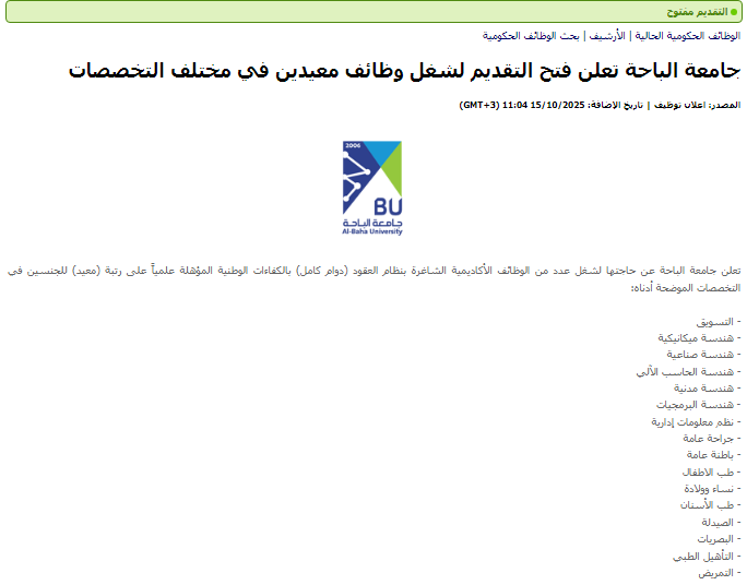 وظيفة جامعة.. أعلنت جامعة الباحة عن فتح باب التقديم لشغل عدد من الوظائف الأكاديمية الشاغرة على رتبة معيد للرجال والنساء، بنظام التعاقد بدوام كامل، وذلك ضمن خطتها لتدعيم الكوادر الأكاديمية وتأهيل جيل جديد من أعضاء هيئة التدريس القادرين على دعم مسيرة الجامعة التعليمية والبحثية.