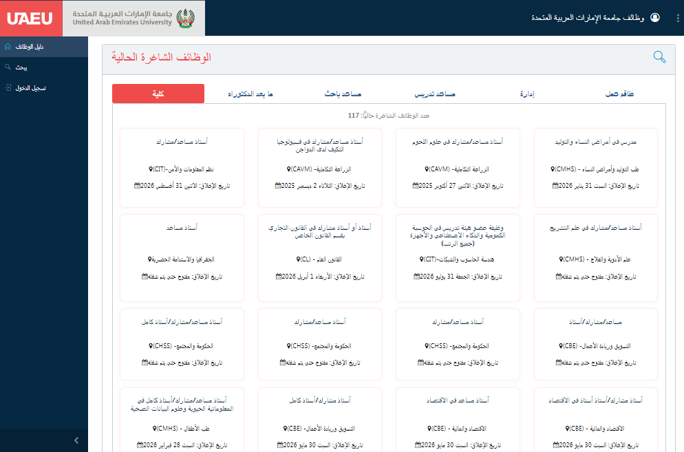وظيفة جامعة .. في خطوة جديدة تعكس طموحها نحو الريادة العلمية والبحثية، أعلنت جامعة الإمارات العربية المتحدة عن طرح مئات الوظائف الأكاديمية في مختلف الكليات والتخصصات، تشمل مجالات الطب والهندسة والعلوم والاقتصاد واللغات والعلوم الإنسانية، إلى جانب تخصصات دقيقة في التكنولوجيا الحديثة والذكاء الاصطناعي.
