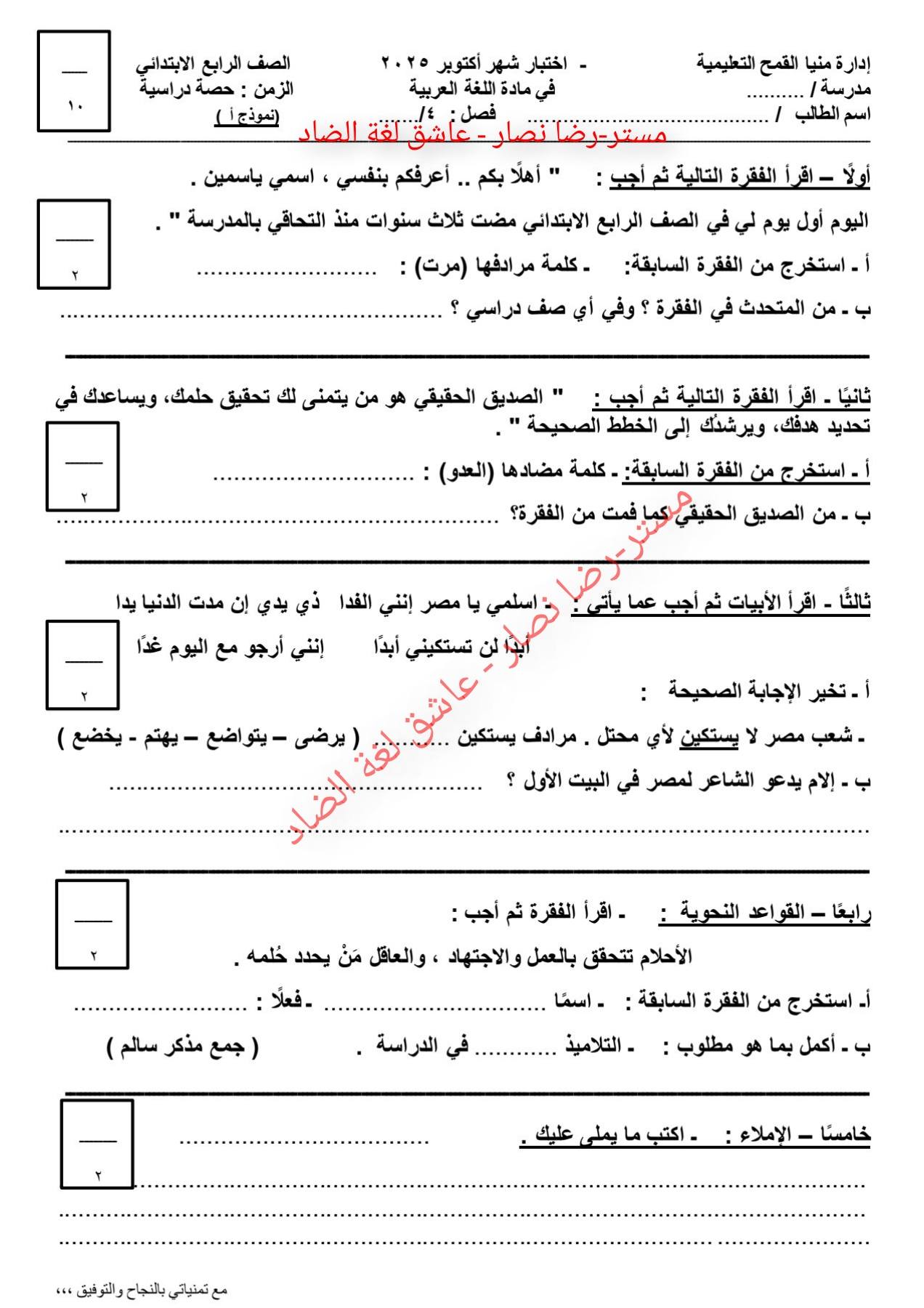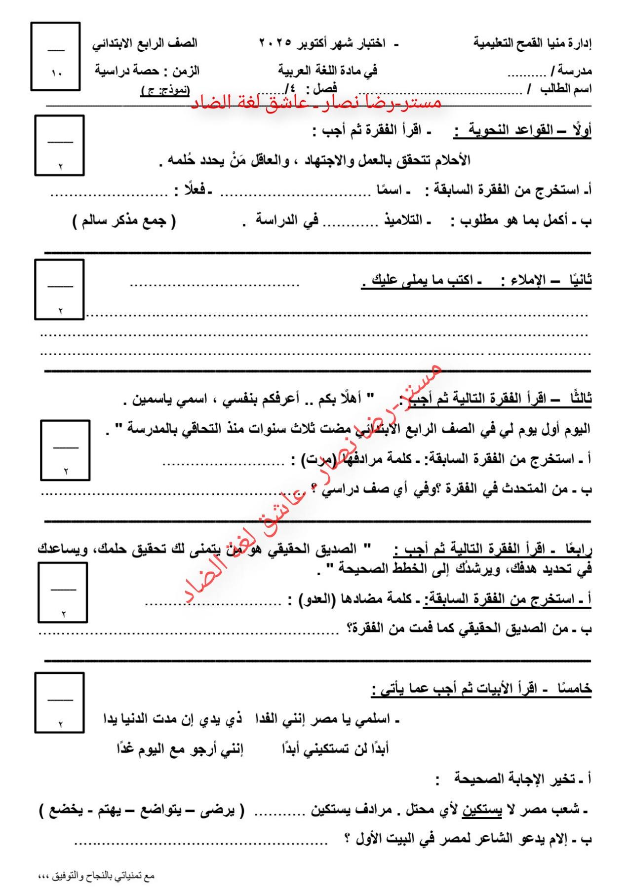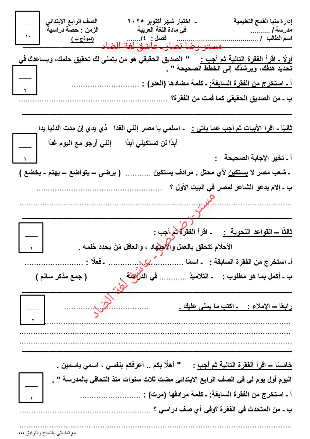 امتحان عربي وإجابته.. وتحميل أقوى مراجعة ليلة امتحان اللغة العربية، تضمن لك دخول الامتحان وهو في جيبك، لطلاب وطالبات الصف الرابع الابتدائي، من خلال امتحانات اللغة العربية، تضمن لك مراجعات نهائية في منهج الفصل الدراسي الأول، والتى تعد مرجعا أساسيا في مراجعات نهائيه، لمقرر المنهج الدراسي للعام الدراسي الجاري 2025-2026، أعدها خبراء المادة في وزارة التربية والتعليم، من أجل مراجعات نهائيه لطلاب الصف الرابع الابتدائي.