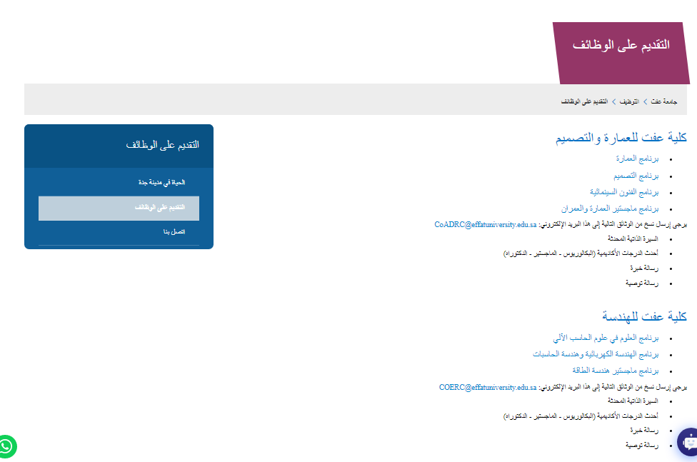 وطلبت جامعة عفت من الراغبين في التقديم إرسال السيرة الذاتية المحدثة، ونسخًا من الدرجات العلمية سواء البكالوريوس أو الماجستير أو الدكتوراه، بالإضافة إلى رسائل الخبرة والتوصية الأكاديمية، إلى البريد الإلكتروني المخصص لكل كلية أو وحدة وفقًا لما هو موضح في الإعلان الرسمي الصادر عن الجامعة.