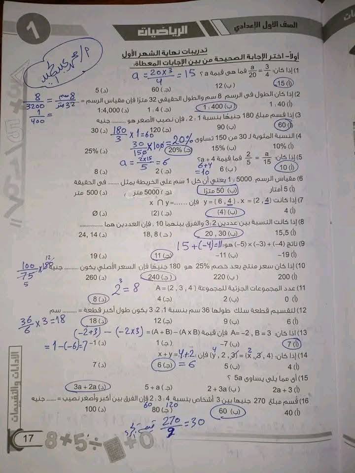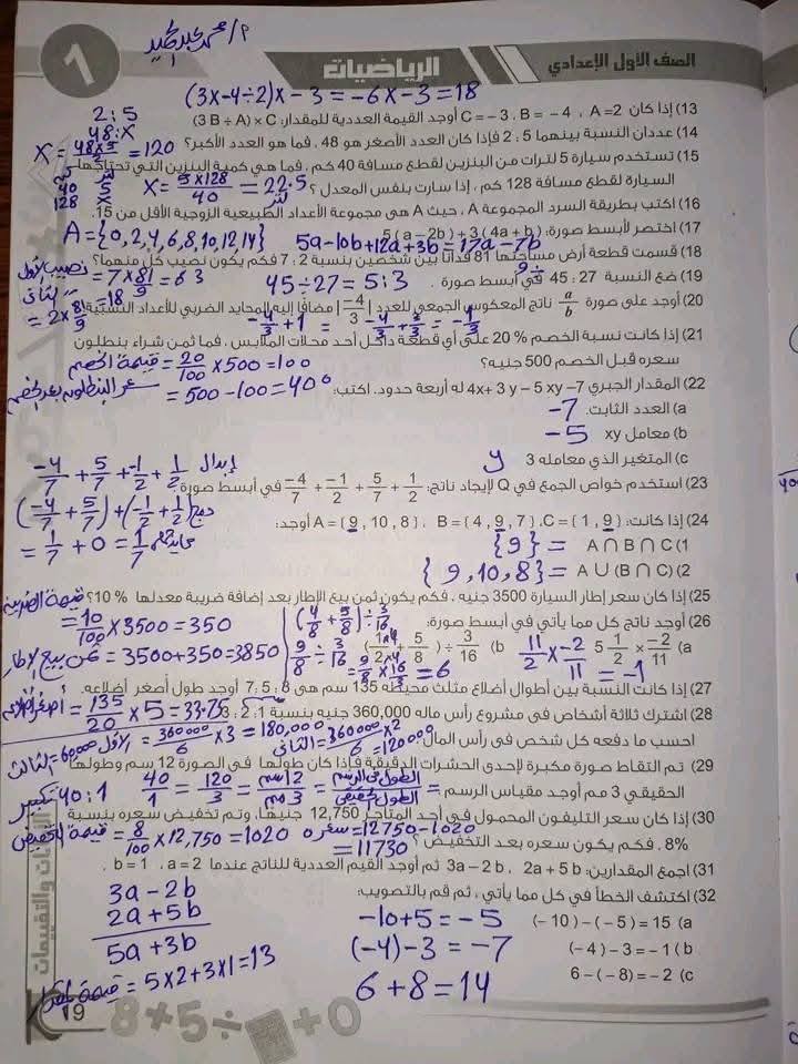 مراجعة الرياضيات وإجابتها عن امتحان شهر أكتوبر أولى إعدادي
