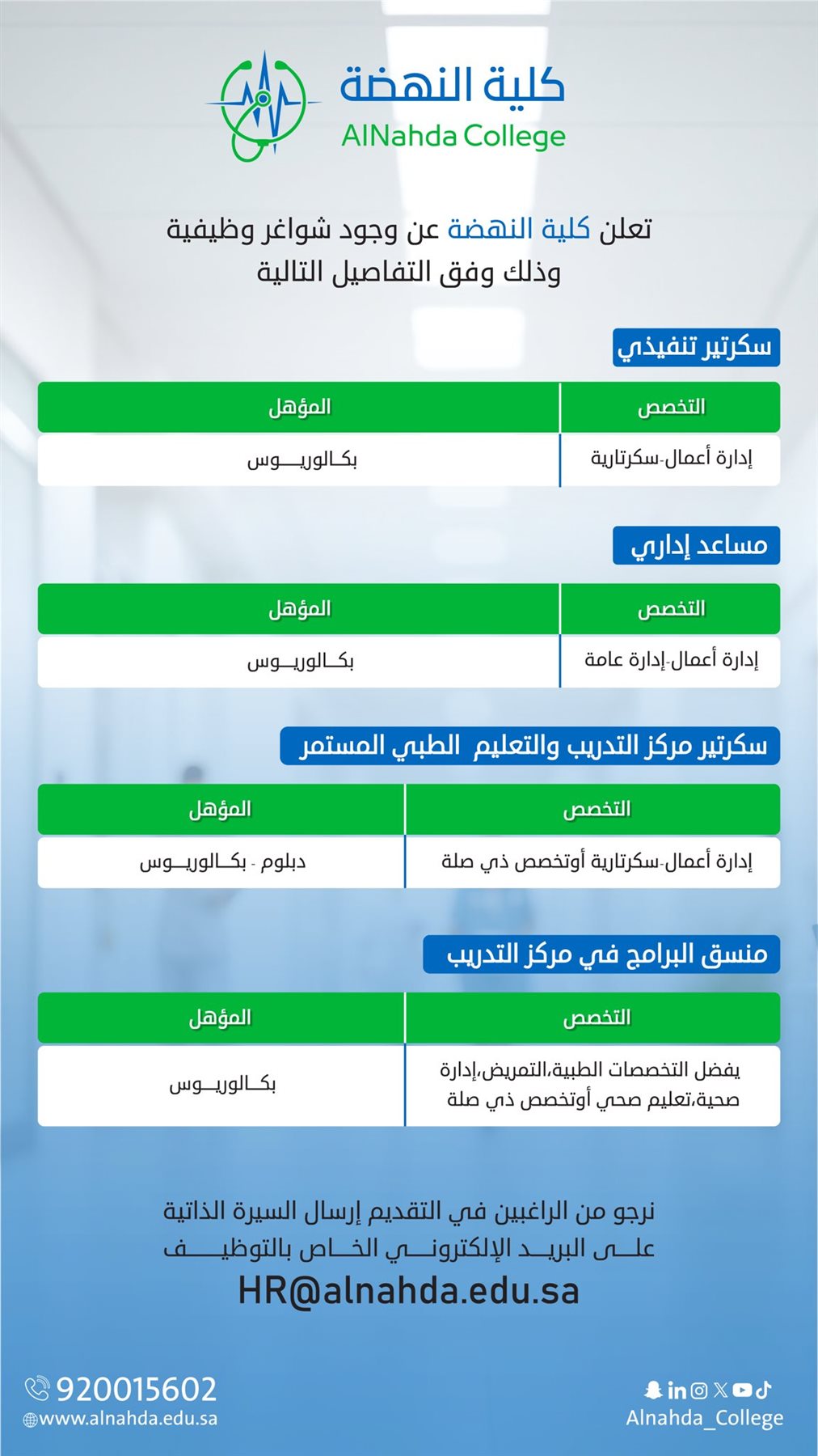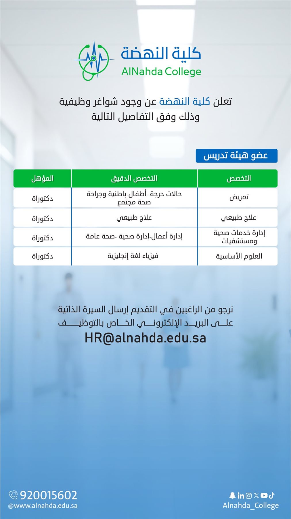 كلية النهضة بالرياض تعلن حاجتها إلى أعضاء هيئة التدريس ووظائف إدارية.. التفاصيل كامله