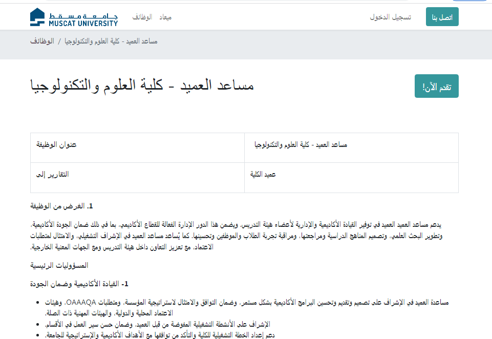 وظيفة جامعة.. أعلنت جامعة مسقط عن طرح مجموعة من الوظائف الأكاديمية والإدارية البارزة ضمن كلياتها المختلفة للعام الأكاديمي الجديد 2025، في إطار سعيها المستمر لتعزيز كفاءاتها التعليمية والإدارية ودعم خططها الاستراتيجية في مجالات التعليم العالي والبحث العلمي وضمان الجودة.