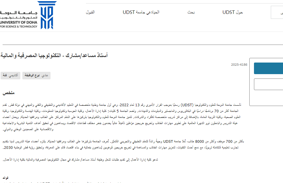 وظيفة جامعة .. تعلن جامعة الدوحة للعلوم والتكنولوجيا (UDST) عن فتح باب التقديم لشغل وظيفة أستاذ مساعد/مشارك في مجال التكنولوجيا المصرفية والمالية بكلية إدارة الأعمال في إطار التوسع الأكاديمي للجامعة.