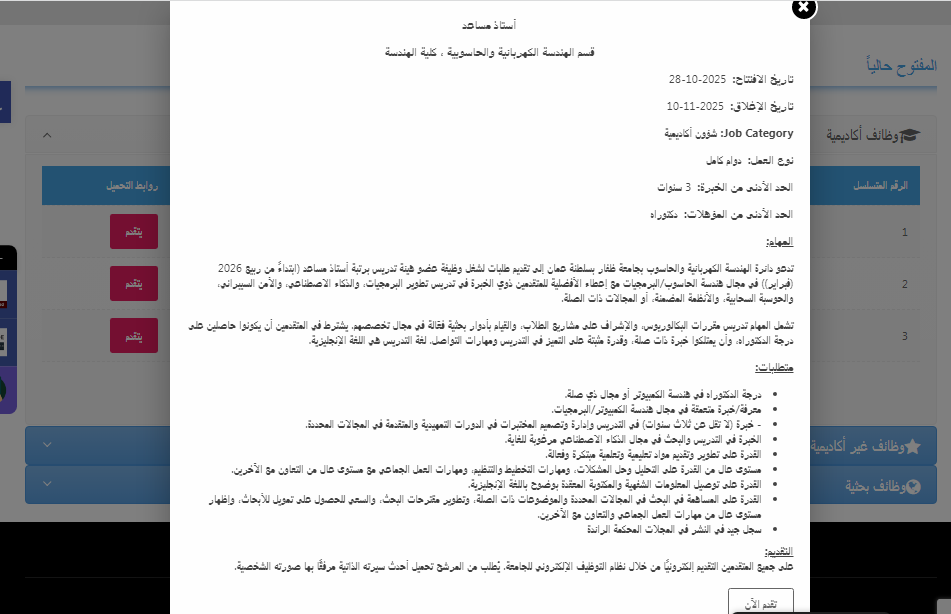 وبحسب ما أوضحته جامعة ظفار، فإن باب التقديم مفتوح حتى العاشر من نوفمبر 2025، على أن يتم التقديم إلكترونيًا فقط من خلال نظام التوظيف الإلكتروني المعتمد لدى الجامعة.