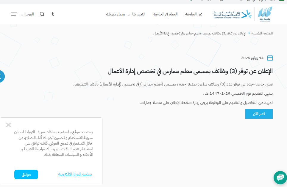 وظيفة جامعة.. في خطوة جديدة تؤكد التزامها بتطوير منظومتها التعليمية وتعزيز كوادرها الأكاديمية، أعلنت جامعة جدة عن فتح باب التقديم لشغل ثلاث وظائف شاغرة بمسمى معلم ممارس في تخصص إدارة الأعمال، وذلك للعمل ضمن الكلية التطبيقية بمدينة جدة.