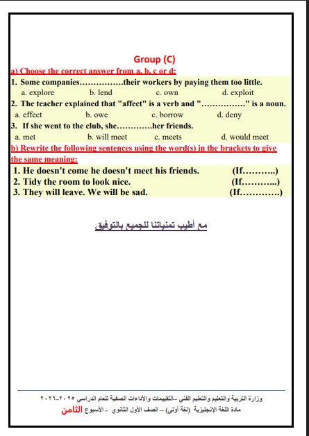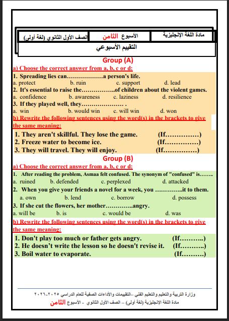 - أول ثانوي اللغة الإنجليزية تقييم الأسبوع الثامن