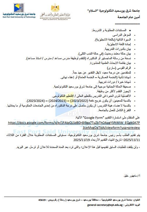 تُعلن جامعة شرق بورسعيد التكنولوجية (السلام) عن حاجتها إلى شغل وظائف أكاديمية شاغرة بنظام التعاقد السنوي أو الندب الكلي طبقًا لحاجة الجامعة، وذلك على النحو التالي: