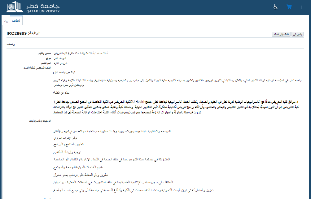 يشترط أن يكون لدى المتقدم رخصة ممرضة مسجلة نشطة في بلد المنشأ أو الإقامة، مع القدرة على الحصول على رخصة التدريس من إدارة المهن الصحية في قطر خلال ستة أشهر من تاريخ التوظيف. يُفضل امتلاك خبرة في المناهج التعليمية القائمة على الكفاءة، وخبرة في اختبار NCLEX-RN، بالإضافة إلى سجل علمي وبحثي يتناسب مع الرتبة المطلوبة، مع القدرة على تعزيز جهود التنوع والمساواة والإدماج في التدريس والبحث والخدمة.