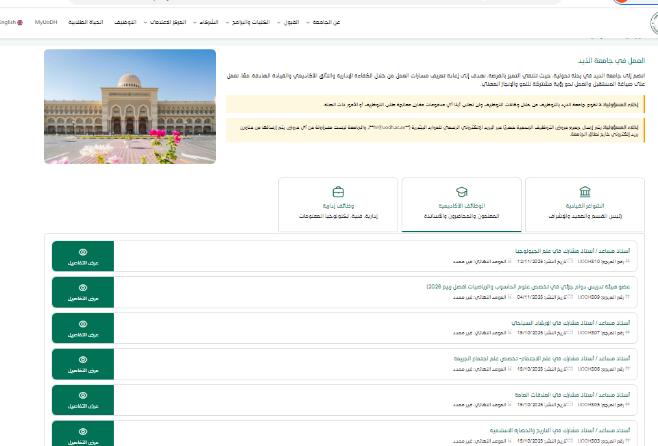 تسعى جامعة الذيد إلى استقطاب أكاديميين ذوي خبرة عالية وقادرين على المساهمة في دعم العملية التعليمية والبحث العلمي، حيث توفر الجامعة بيئة أكاديمية متقدمة تعتمد على التكنولوجيا الحديثة والمناهج التعليمية المتطورة، ما يجعلها وجهة مفضلة للباحثين عن فرص مهنية مميزة داخل دولة الإمارات.