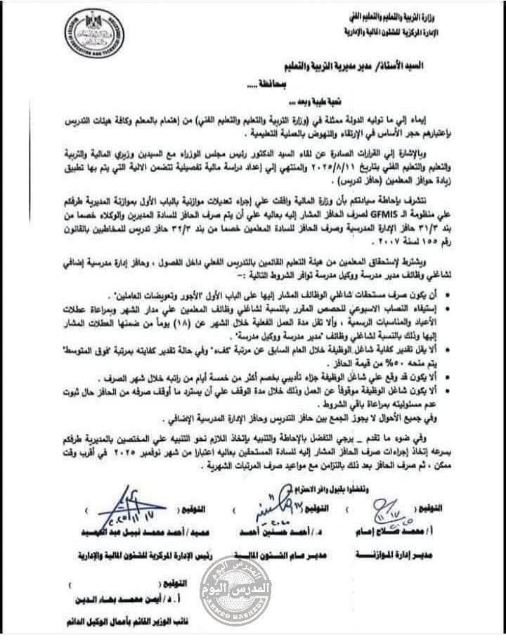 هام.. ضوابط صرف حافز التدريس بدءًا من نوفمبر 2025.. مستند