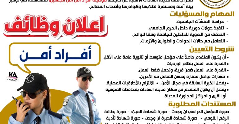 تعلن جامعة مدينة السادات الأهلية عن حاجتها لتوظيف أفراد أمن (من الجنسين) للمساهمة في توفير بيئة آمنة ومستقرة لطلابها وكوادرها وأصحاب المصالح للقيام بالمهام والمسئوليات، وعلى الراغبين في الحصول على وظائف جامعة مدينة السادات الأهلية، الدخول على موقع جامعة مدينة السادات الأهلية عبر شبكة الانترنت.