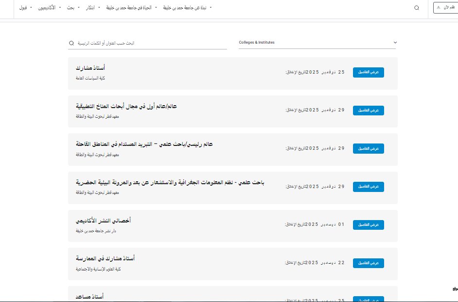 كما أعلنت الجامعة عن سلسلة من الوظائف البحثية المتقدمة داخل معهد قطر لبحوث البيئة والطاقة، الذي يعد مركزًا بحثيًا متطورًا يسهم في إيجاد حلول علمية مبتكرة للعديد من التحديات البيئية والمناخية.