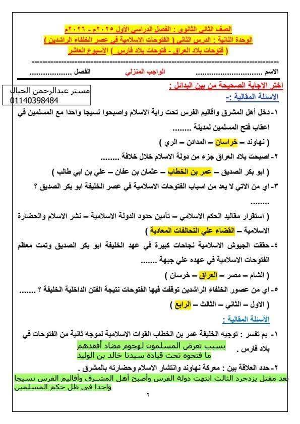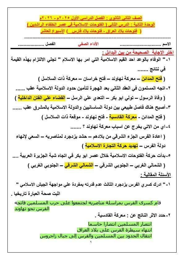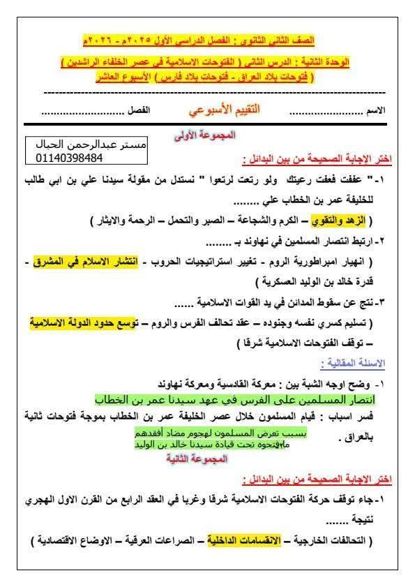 أسئلة تقييمات الأسبوع العاشر في التاريخ وإجابتها الصف الثاني الثانوي 2025