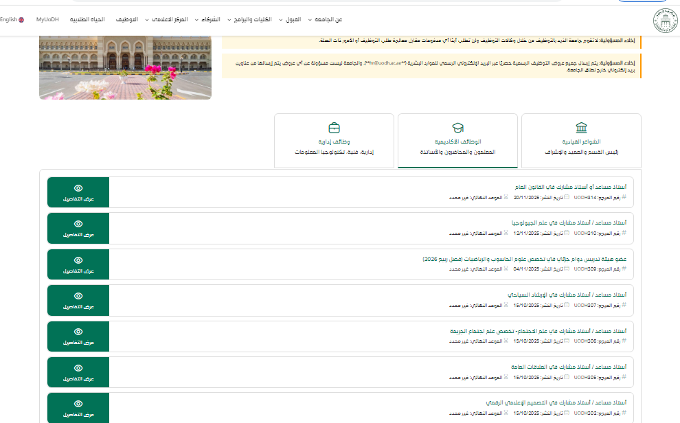 كما أعلنت الجامعة عن وظيفة أستاذ مساعد أو أستاذ مشارك في الإرشاد السياحي، برقم مرجع UODH307 والمنشورة في 15 أكتوبر 2025، نظرًا لأهمية هذا التخصص في دعم قطاع السياحة وإعداد كوادر أكاديمية مؤهلة لتدريس مناهج الإرشاد السياحي وفق أعلى المعايير.