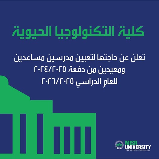 مطلوب مدرسين مساعدين حديثي التخرج حاصلين على درجة الماجستير في التكنولوجيا الحيوية الطبية والصيدلانية من جامعة مصر للعلوم والتكنولوجيا.