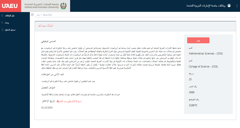 وتولي جامعة الإمارات أهمية خاصة لهذا المنصب في ظل التوسع الكبير في الأبحاث المتعلقة بالذكاء الاصطناعي، البيانات الضخمة، النمذجة الرياضية، والحوسبة المتقدمة، وهي مجالات ترتبط مباشرة بالقطاعات العلمية والصناعية ذات الأولوية داخل الدولة.