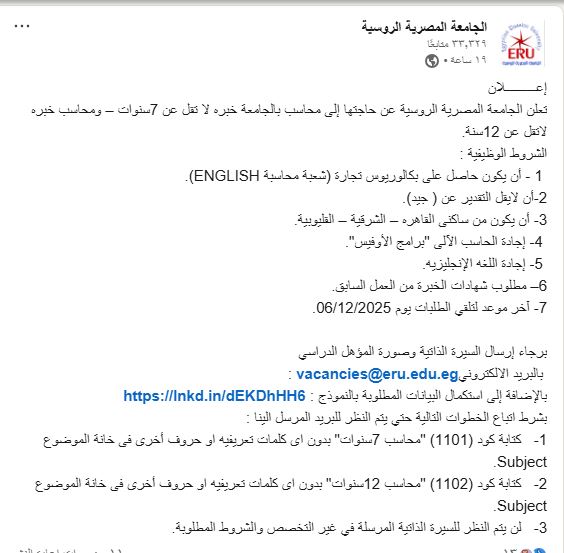 تعلن الجامعة المصرية الروسية عن حاجتها إلى محاسب بالجامعة خبره لا تقل عن 7سنوات – ومحاسب خبره لاتقل عن 12سنة.