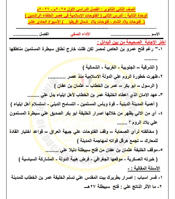 أسئلة تقييمات الأسبوع الـ 11 في التاريخ وإجابتها الصف الثاني الثانوي 2025