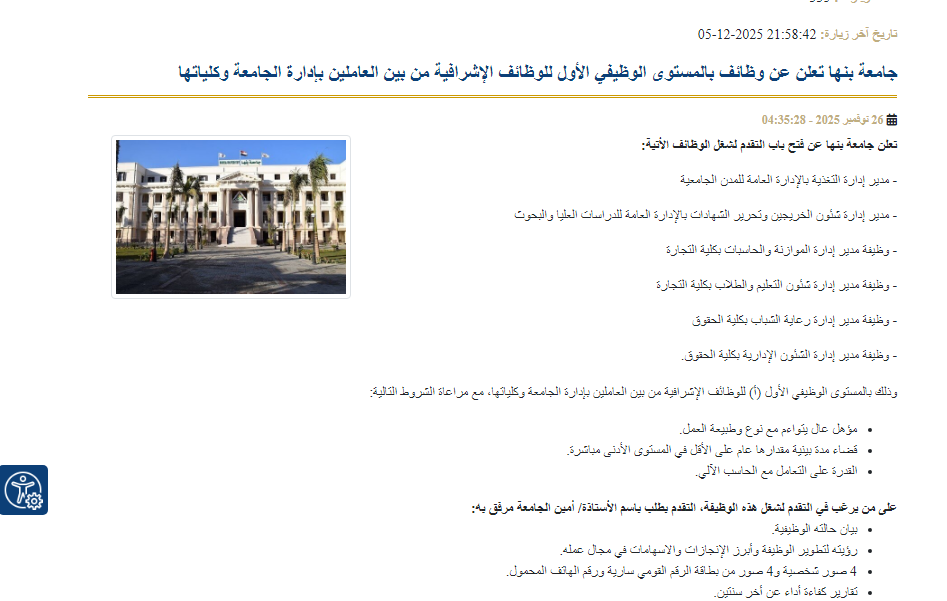 يأتي هذا الإعلان في إطار حرص جامعة بنها على تعزيز الانضباط الإداري وتوفير فرص متكافئة للعاملين المؤهلين لشغل المناصب الإشرافية، بما يسهم في رفع مستوى الكفاءة المؤسسية وتحسين جودة الخدمات الجامعية.