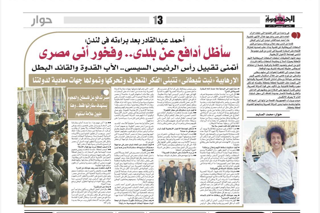 **أحمد عبدالقادر ميدو: هذه الجماعة " نبت شيطاني" تتحرك من الخارج وتمولها أجهزة معادية، وهم من حاولوا اقتحام السفارات المصرية وغيرها، وهم من روجوا الأكاذيب بعد توقيفي.لكني أقولها بكل ثقة " في كل مرة يسقطون ويعودون بخيبة الأمل مكسروين لأن الحق معنا ومصر ستظل هى الدولة القوية العظيمة فى المنطقة