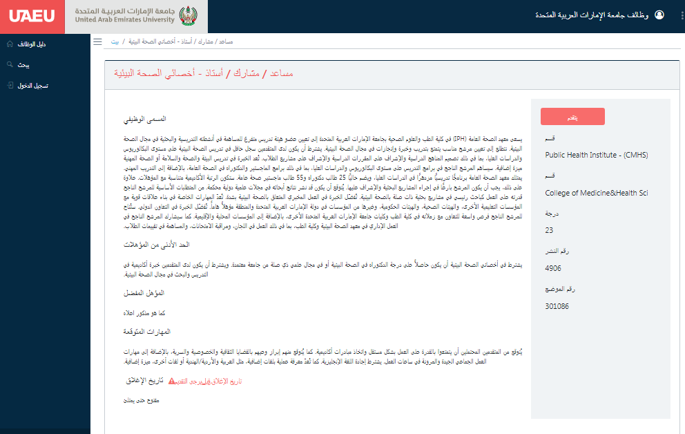 وظيفة جامعة.. أعلنت جامعة الإمارات العربية المتحدة عن فتح باب التقديم لوظائف أكاديمية جديدة بمعهد الصحة العامة التابع لكلية الطب والعلوم الصحية، وذلك لشغل مناصب "مساعد أستاذ" أو "أستاذ مشارك" أو "أستاذ" في تخصص الصحة البيئية.