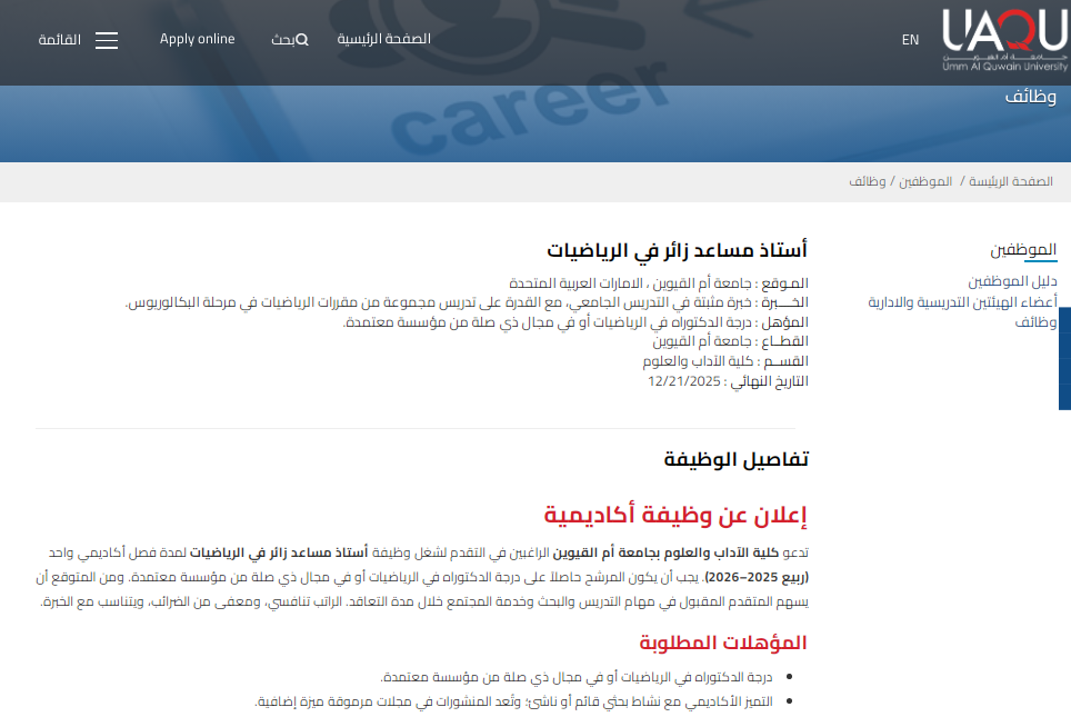 وتأتي هذه الفرصة ضمن جهود جامعة أم القيوين المستمرة لاستقطاب الكفاءات الأكاديمية المتميزة، ودعم جودة التعليم الجامعي، وتوفير بيئة تعليمية وبحثية متطورة تواكب المعايير الدولية في التعليم العالي.