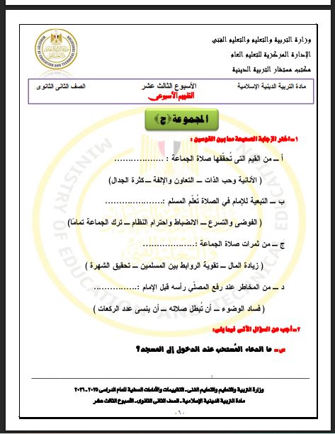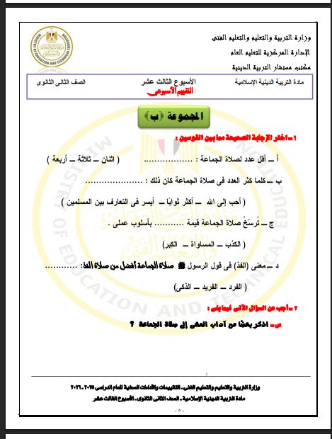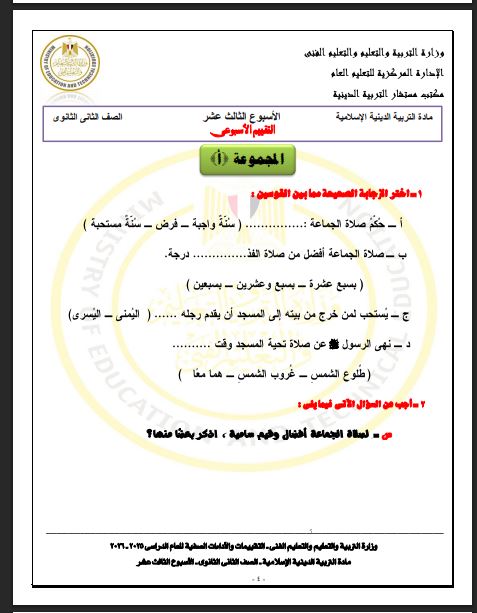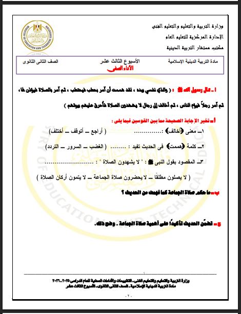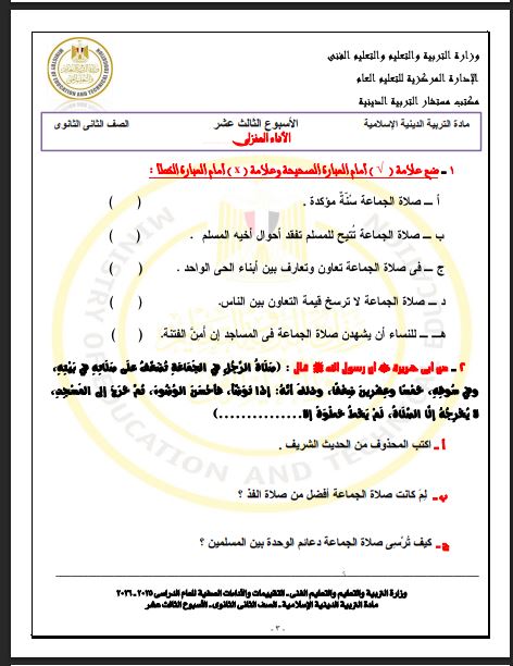 أسئلة تقييم الأسبوع الـ 13 التربية الاسلامية ثانية ثانوي